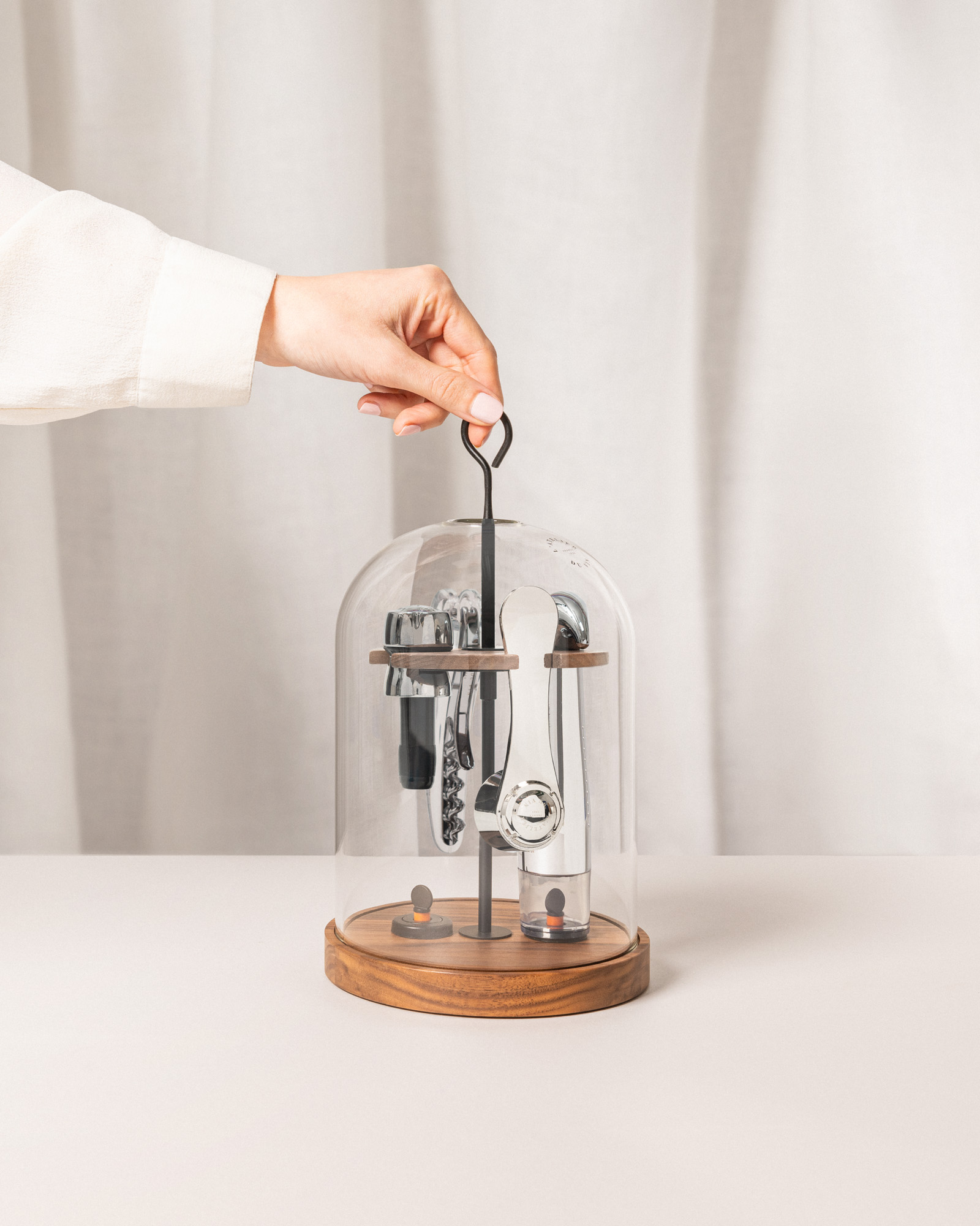 A striking collection of essential wine tools housed beneath a glass dome on a solid walnut base. A perfect gift for wine enthusiasts and aesthetes alike.