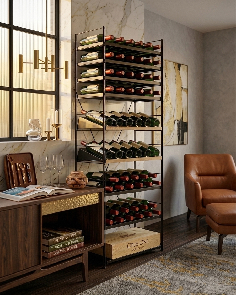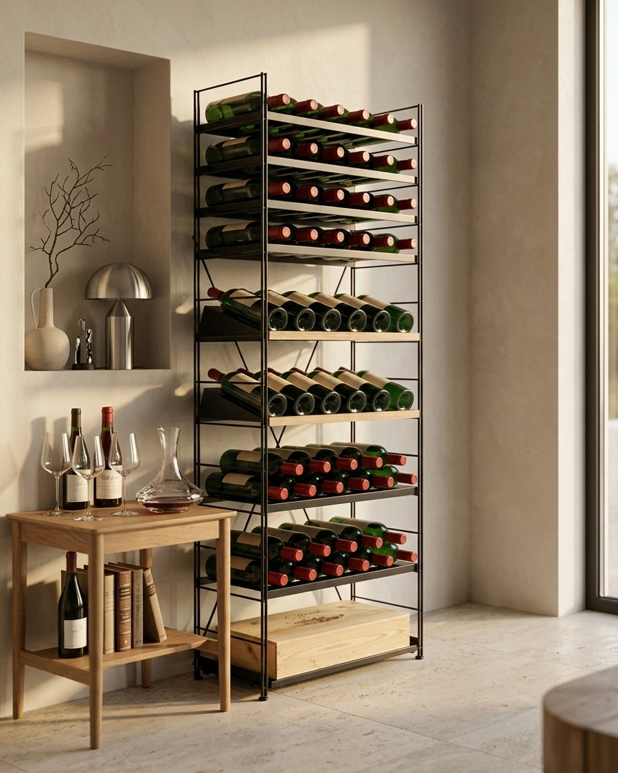 A modular wine rack system allows wine storage to evolve over time. Shelves, drawers, and accessories can be moved, replaced, or added, allowing the structure to adapt as a wine collection grows.